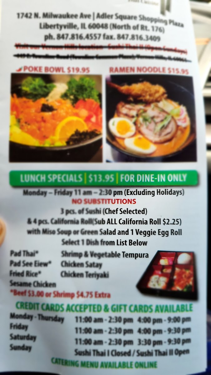 Welcome to Sushi Thai Libertyville, a gem for lovers of both sushi and Thai cuisine, nestled at 1742 N Milwaukee Ave, Libertyville, IL. The menu bursts with flavor and variety, offering an array of sushi rolls, with the Rainbow and Serpentine Rolls frequently highlighted by satisfied customers. For those craving Thai dishes, the Tofu Pad Thai delivers a punch of flavor, while the Spring Rolls are celebrated for their freshness.